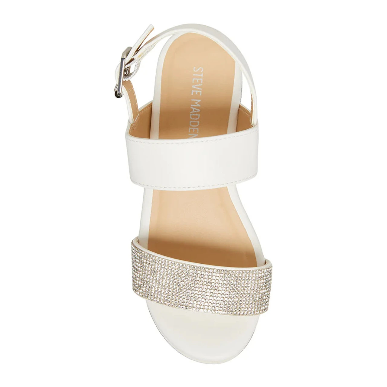 Glitter stacked on the sole and rhinestones embellished on the front strap give this cork wrap sandal texture.