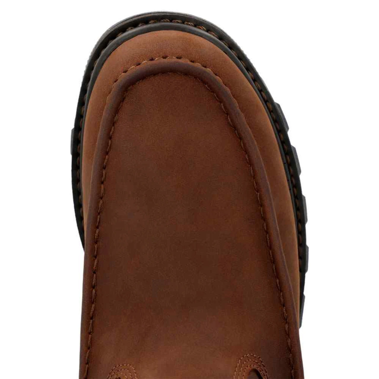 The Rocky Rams Horn Waterproof Pull-On Work Boot is a tough, oil and slip resistant rubber outsole boot with a fiberglass shank, rebound cushioning midsole, and EnergyBed LX insoles for comfort, safety, and durability. It complies with ASTM F2892 electrical hazard classification and keeps feet cool and dry.