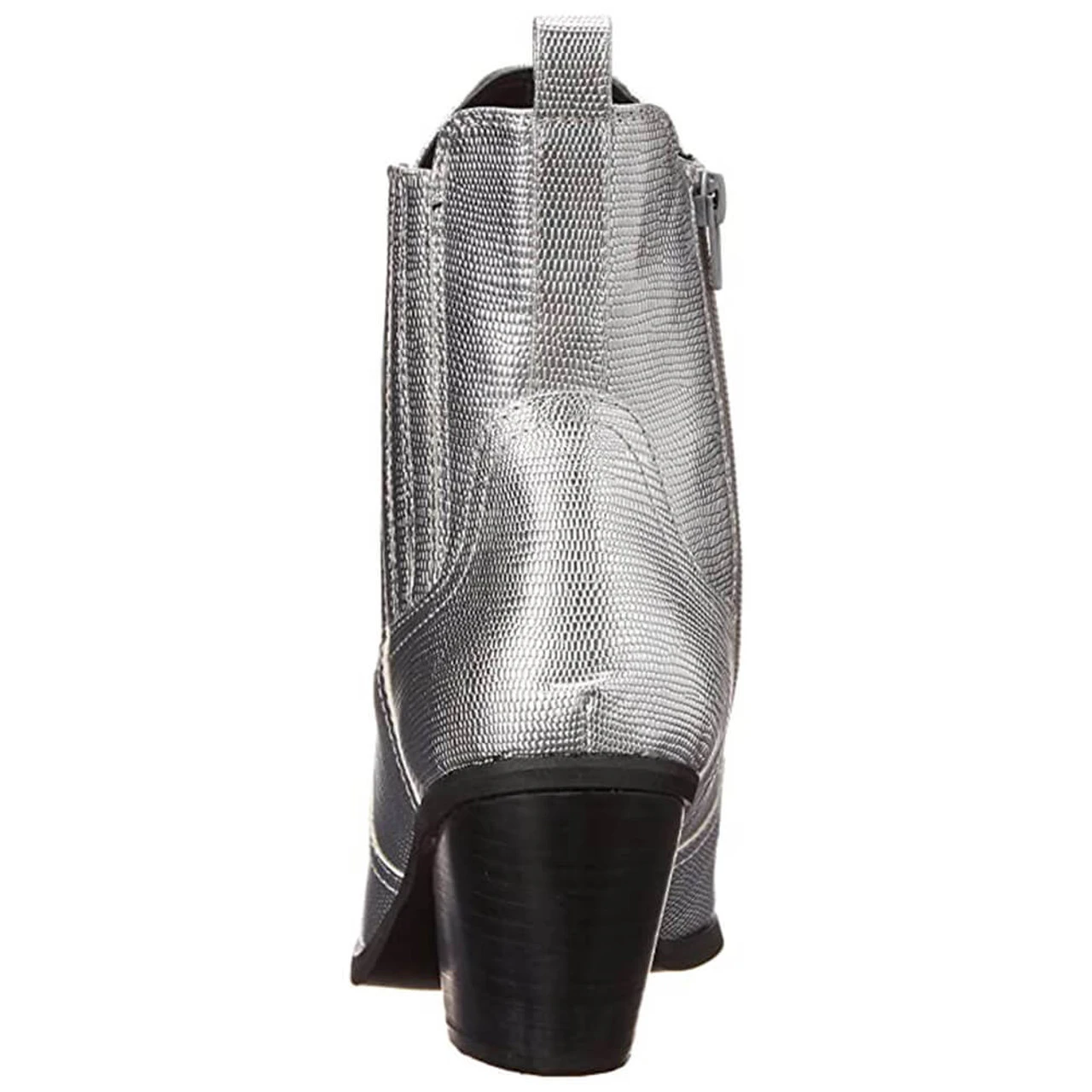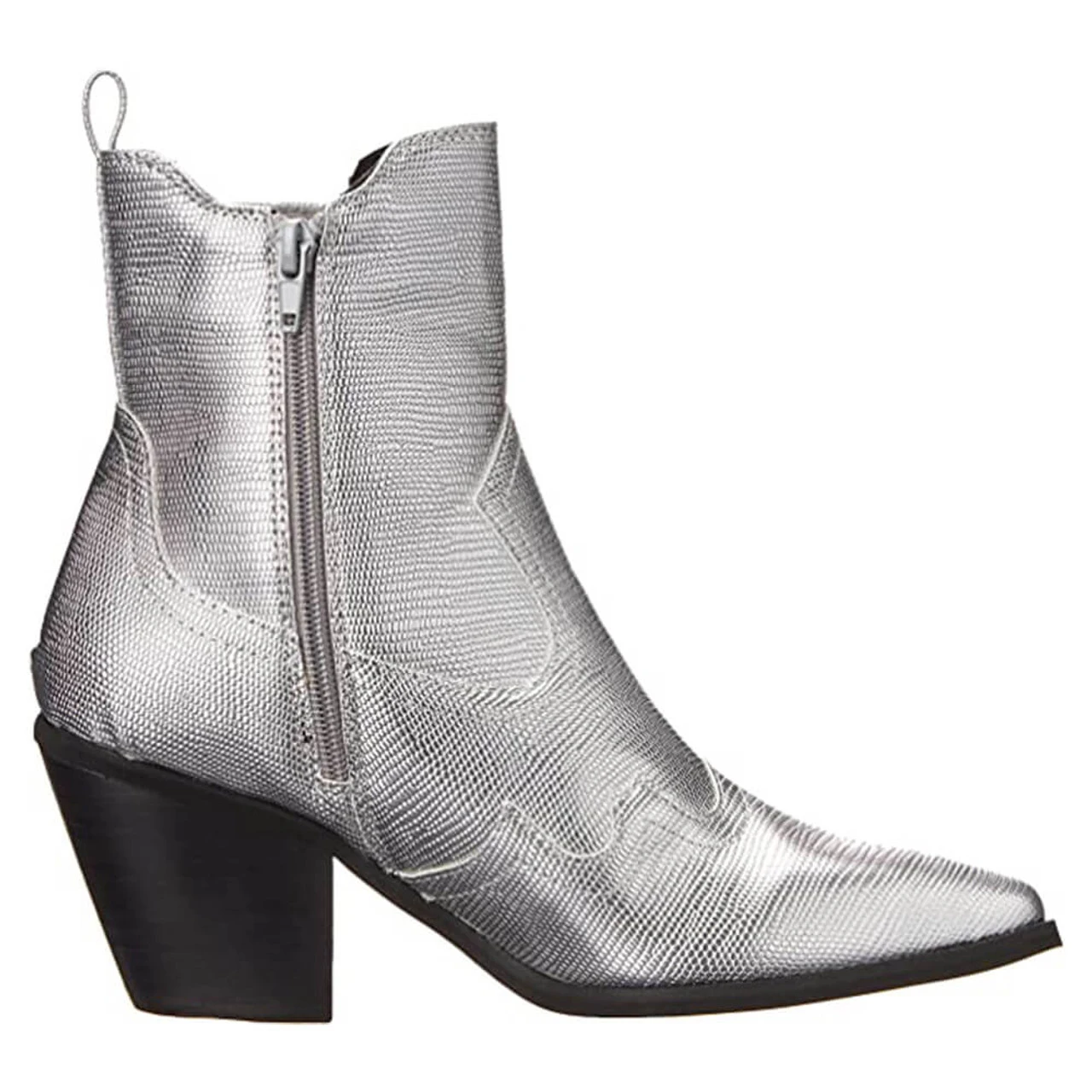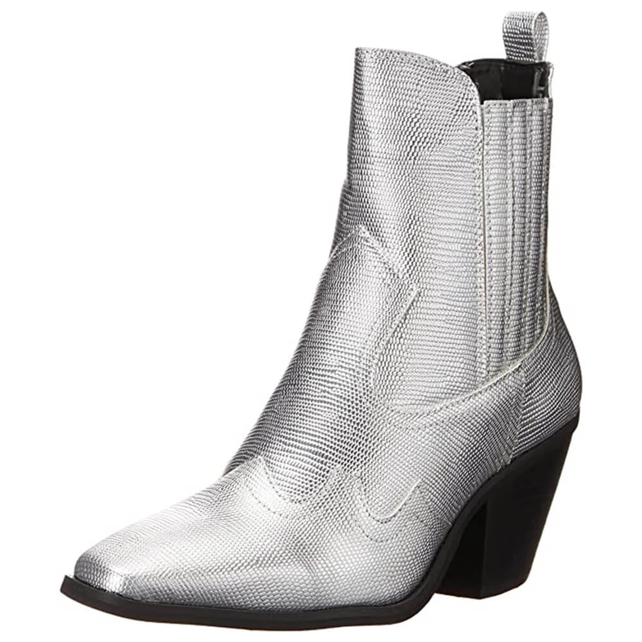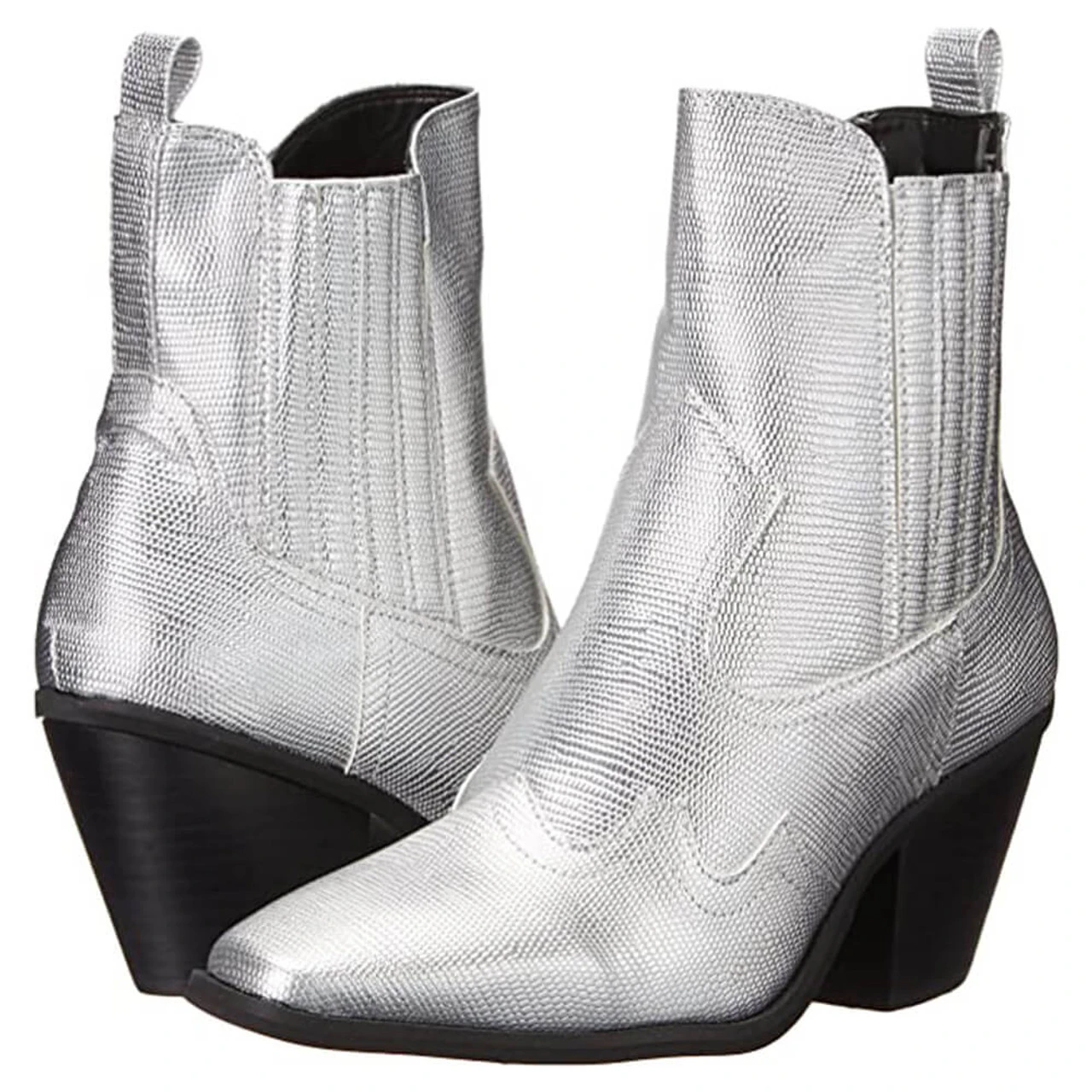 Shake it up on the dance floor with this pair of metallic silver western style boots. The paneled ankle shaft keeps your ankle protected and comfortable while the supported block heel will make you want to wear these bad boys all day. They were made for dancing and lighting up the night in your favorite party dress.