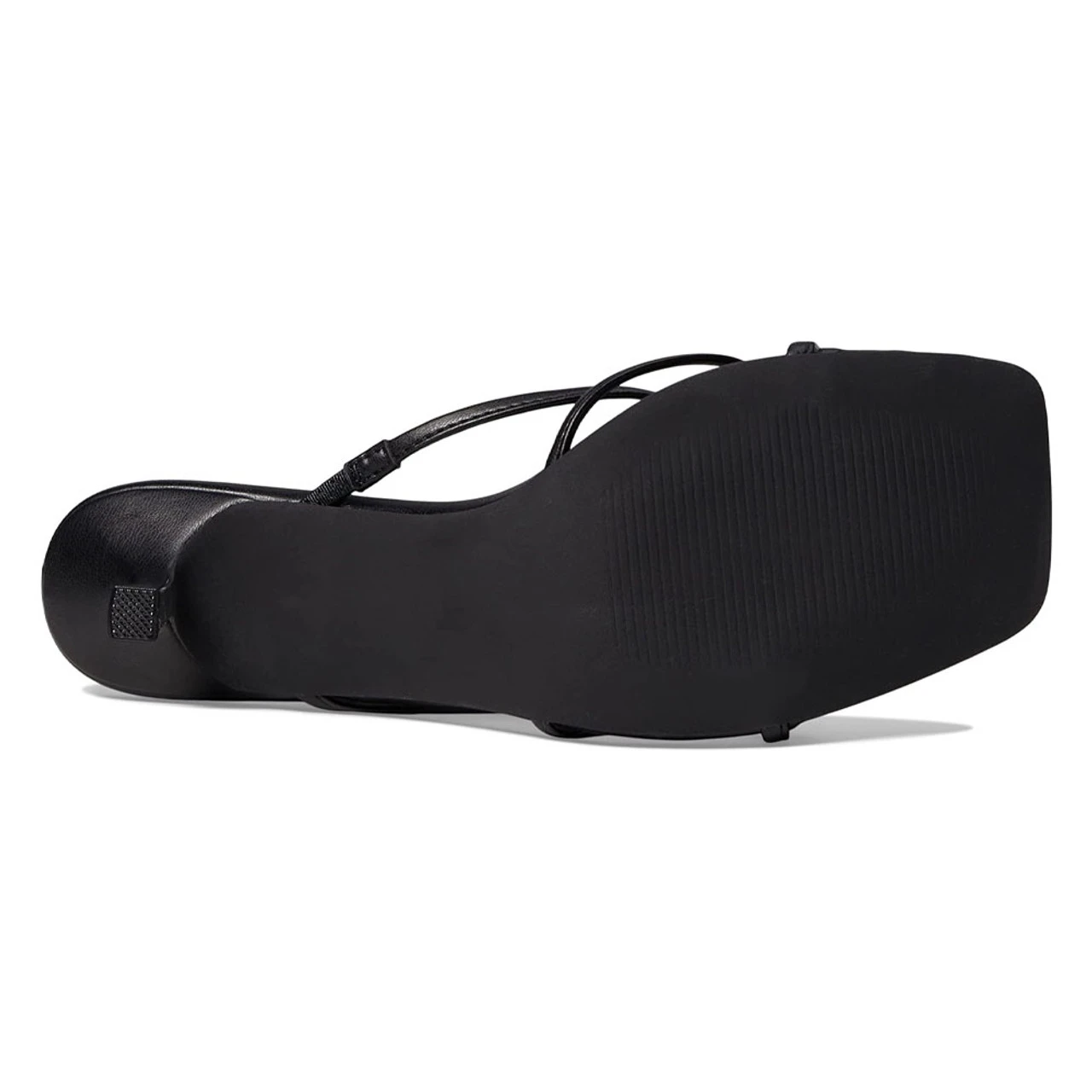 Strappy kitten heels include a square toe and lip on style.Â