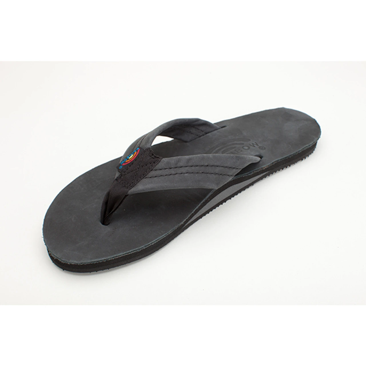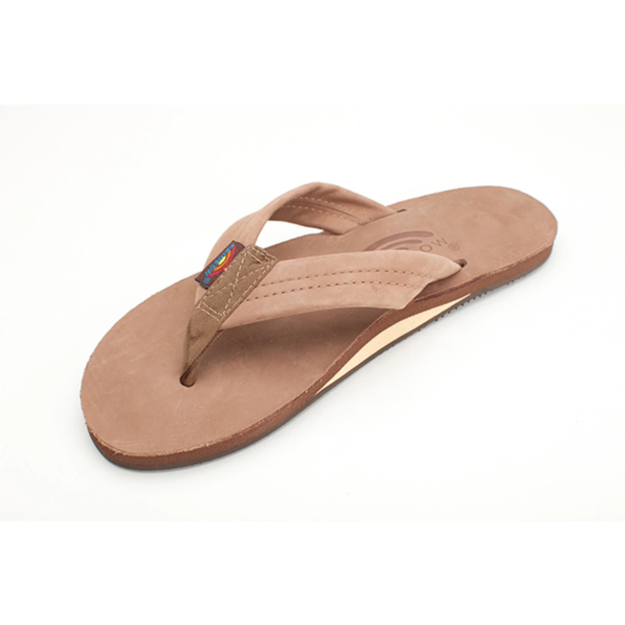 The single layer premier leather sandal is made with top grade nubuck leather; the top sole is embossed with the Rainbow® logo. The strap, also nubuck leather; is double stitched, and the nylon toe piece is secured with a box X stitch, all using bonded nylon thread.