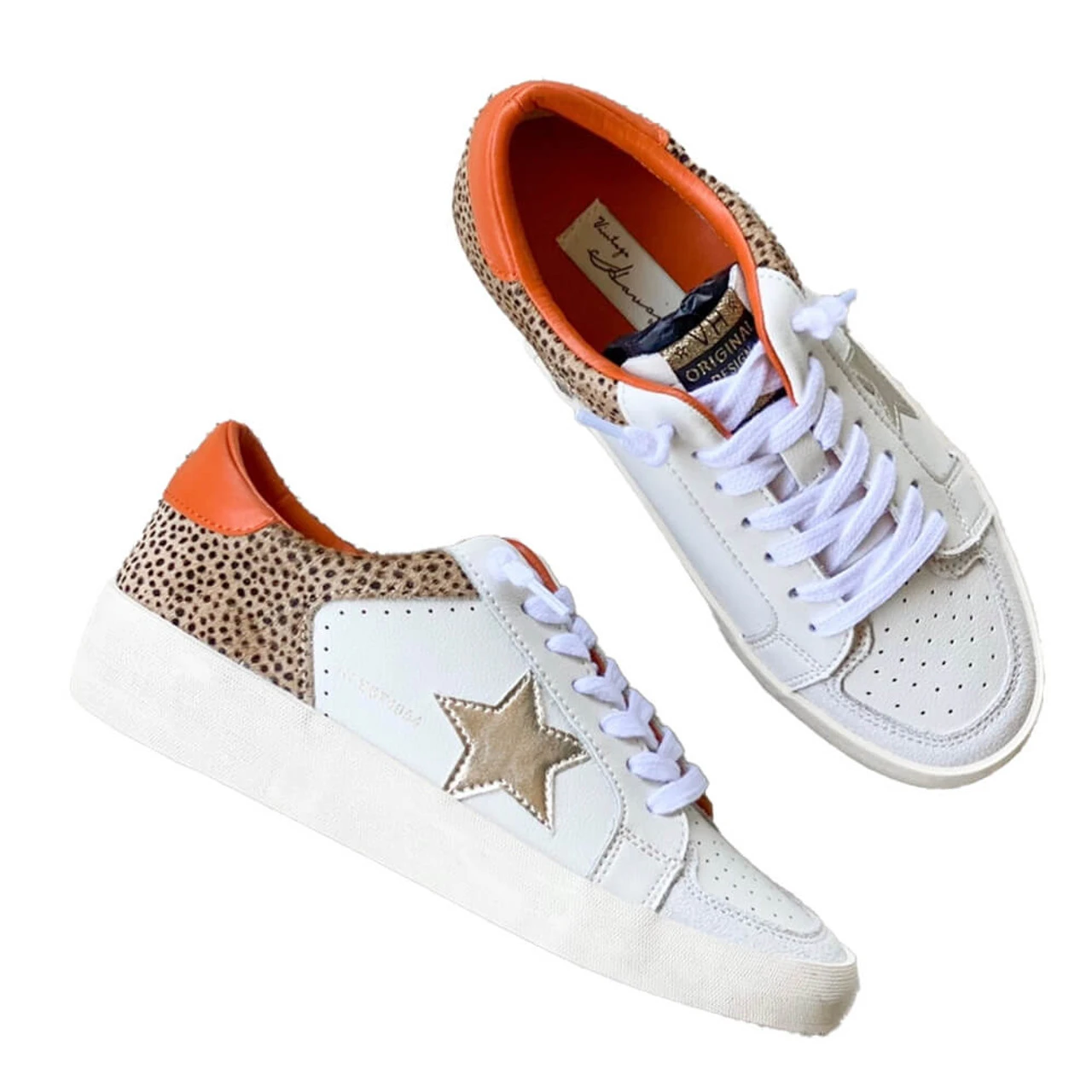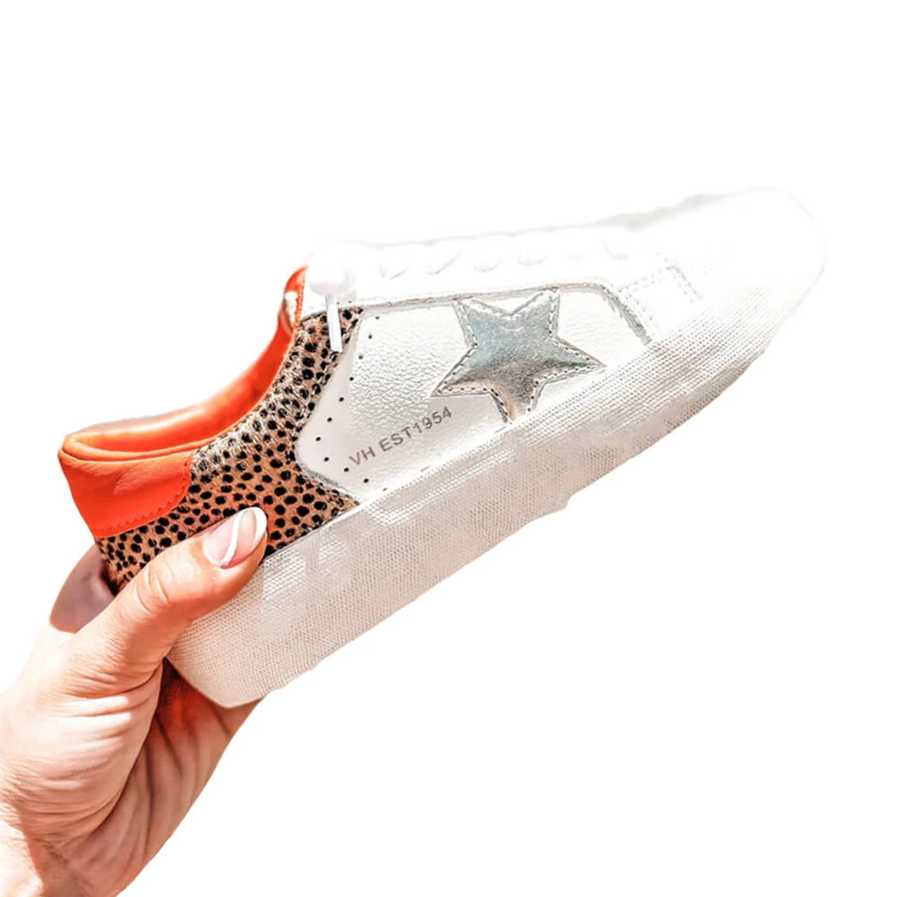 This vibrant sneaker is unique and stands out from other casual and chic shoe options. With it’s poppy orange color mixed with spotted animal print and textured fabrics, it’s the perfect trendy option to wear with your cutest outfits.Â